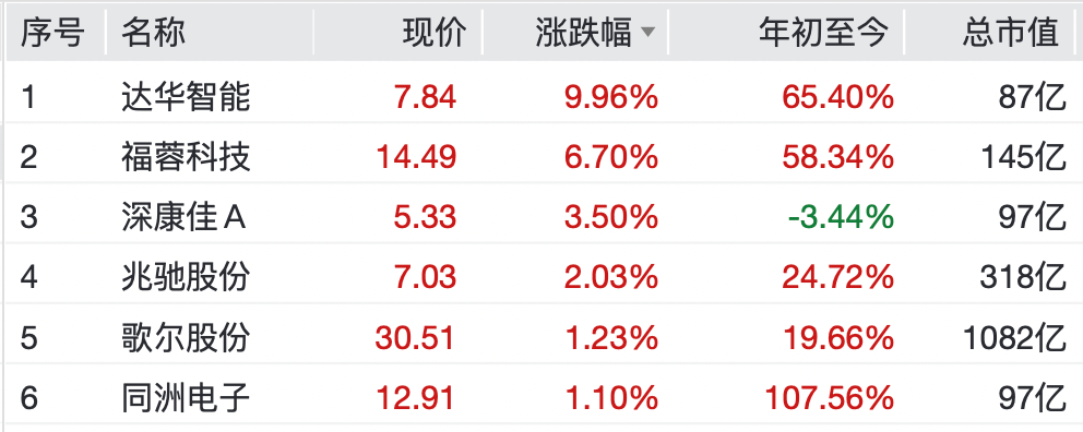 个股方面,达华智能(维权)录得10cm涨停,福蓉科技(维权)一度涨停。兆驰股份、深康佳A、同洲电子、歌尔股份等跟涨。