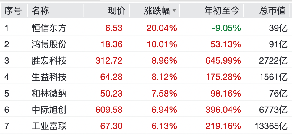 个股方面,恒信东方(维权)录得20cm涨停,鸿博股份(维权)录得10cm涨停,工业富联、胜宏科技、生益科技、和林微纳等涨幅居前。