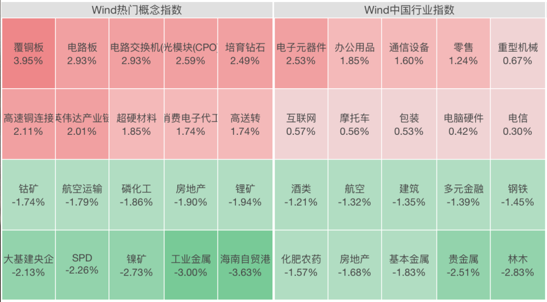 从板块看,光模块(CPO)持续拉涨,创新药、消费电子、商业百货、培育钻石概念板块走强;而贵金属、房地产等板块领跌。