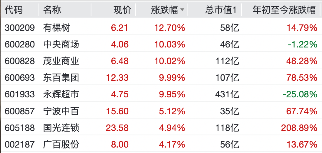 个股方面,中央商场、茂业商业、东百集团、永辉超市均录得10cm涨停,有棵树涨超12%,国光连锁、广百股份、中百集团(维权)、三江购物等涨幅居前。